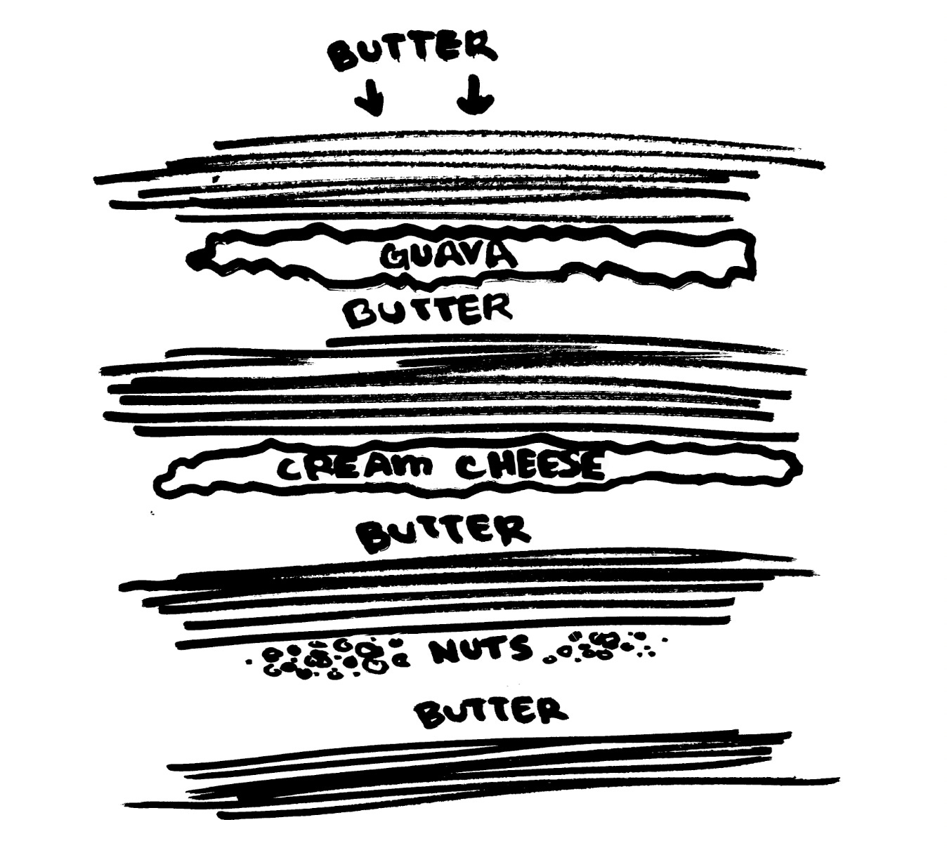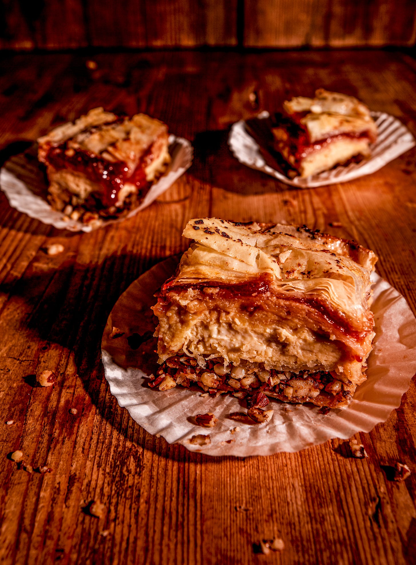 I had my hospital bag packed weeks ahead of delivery, but because it sat in the corner of our bedroom for so long, I kept raiding the snacks I’d packed “for postpartum” in the middle of the night. To keep myself from wiping out my stash entirely, I decided to make a little something sweet: a mashup of my two favorite desserts growing up—Cuban pastelitos, flaky pastries filled with guava and cream cheese, and Middle Eastern baklava, made of dozens of buttery, paper-thin layers of phyllo dough, filled with chopped nuts and spices, baked until golden, and soaked in sticky syrup.